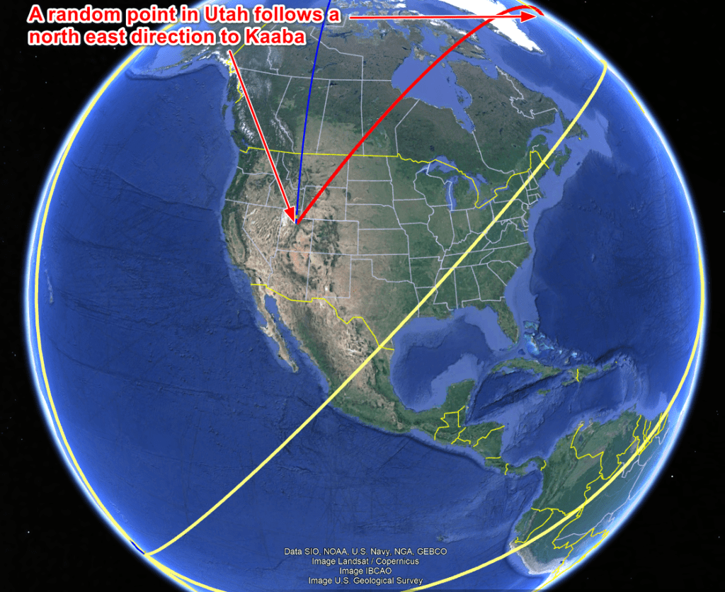 If we follow the Geodesic path (having the curvature of the earth as a primary source of direction, then NE supercedes the current teachings of the Messenger of the Covenant. Even by this logic, however, you must use the Earth’s core as your datum, where the projection begins by looking down at the core then establishing the Qibla.