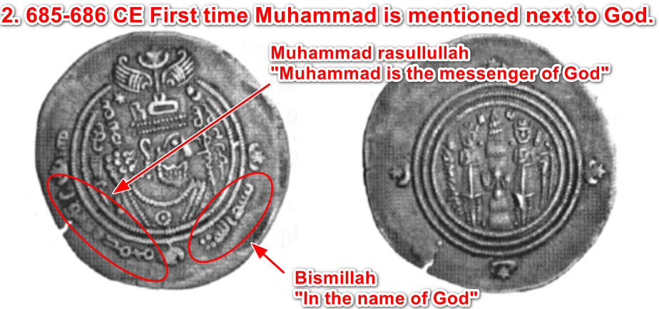 - Onset of disaster: This period by the Umayyads mark the onset of Muhammad’s name appearing with increasing frequency next to God Almighty.