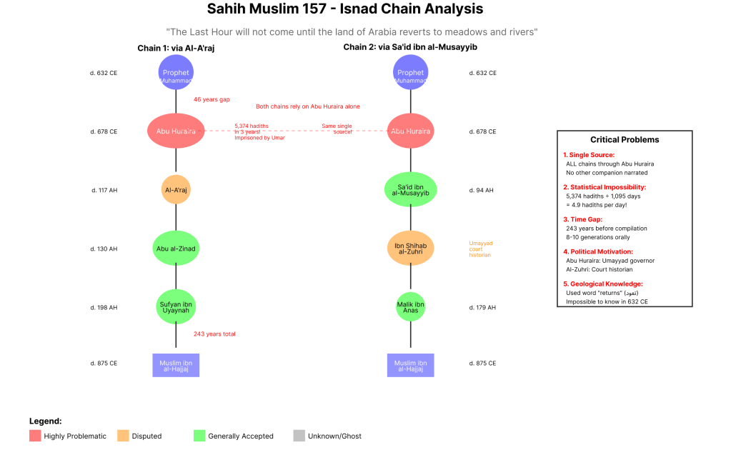 Figure 1: Complete chain of narration showing all narrators, reliability issues, and the fatal single-source problem through Abu Huraira. Color coding: Red = Highly Problematic, Orange = Disputed, Green = Generally Accepted