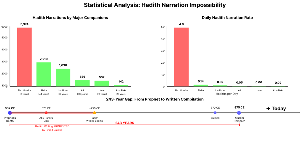Figure 2: Mathematical proof showing (1) Hadith narrations by companion comparison, (2) Daily narration rate impossibility, and (3) The 243-year timeline from Prophet to written compilation