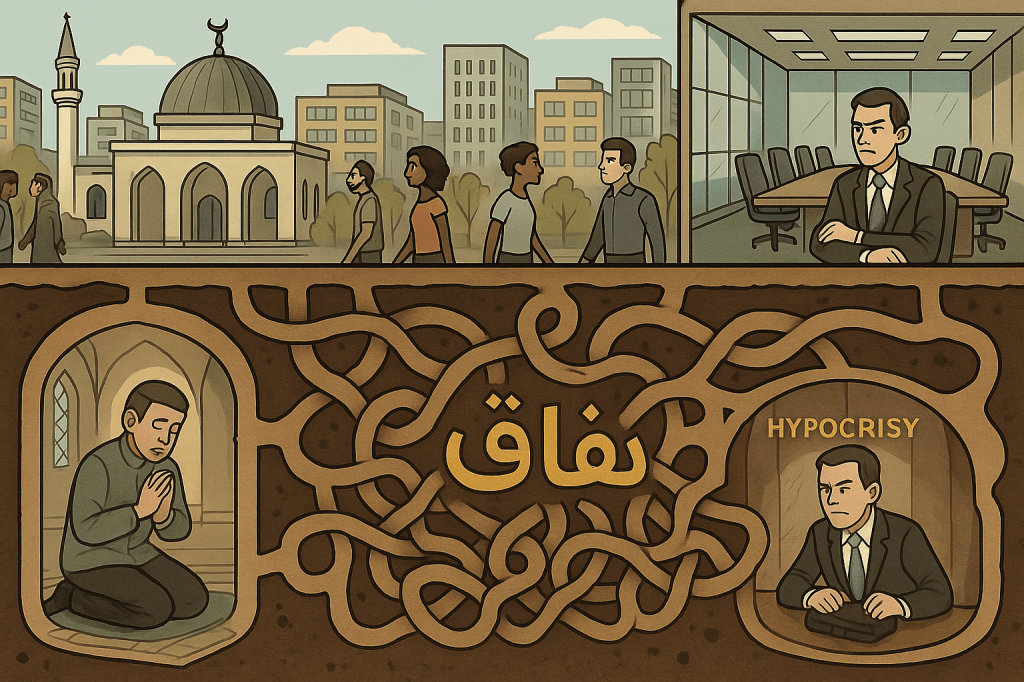 The Arabic root ن-ف-ق (n-f-q) describes a tunnel with two openings – the hypocrite maintains secret passages between incompatible worlds. The form munāfiq (مُنَافِق) indicates active, continuous duplicity, not passive failure.