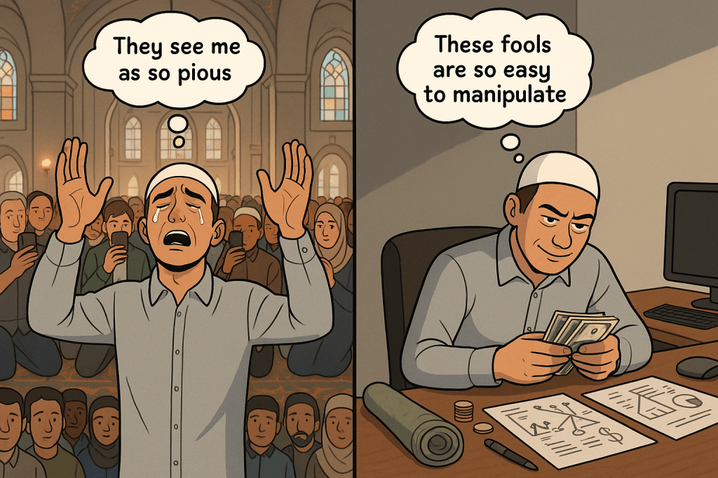 The hypocrite’s fundamental identity: ego worship. Their own desires, image, and benefit become their deity. Every religious act serves self-interest. This differs fundamentally from believers who fail – believers worship God imperfectly; hypocrites worship themselves perfectly.