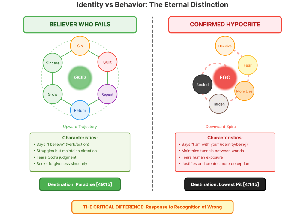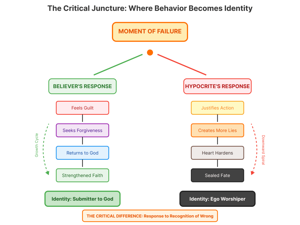 The core question: What transforms someone from a believer who fails into a hypocrite who cannot return? The answer lies not in the severity of sins but in the fundamental orientation of identity. When duplicity shifts from occasional failure to core essence, when ego worship replaces God worship, when doubt becomes entrenched rather than transitional – the person crosses from behavior into identity.