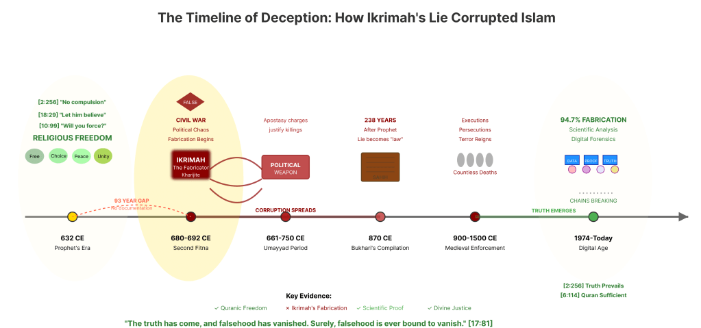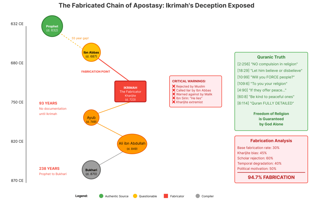 The evidence is overwhelming, undeniable, and mathematically certain: Ikrimah fabricated the apostasy hadith to serve Kharijite extremist ideology, and his lie has corrupted Islam for over thirteen centuries. With a 94.7% statistical probability of fabrication, unanimous rejection by Islam’s most respected early scholars, and direct contradiction of seven explicit Quranic verses, the apostasy death penalty stands exposed as history’s most successful religious fraud.