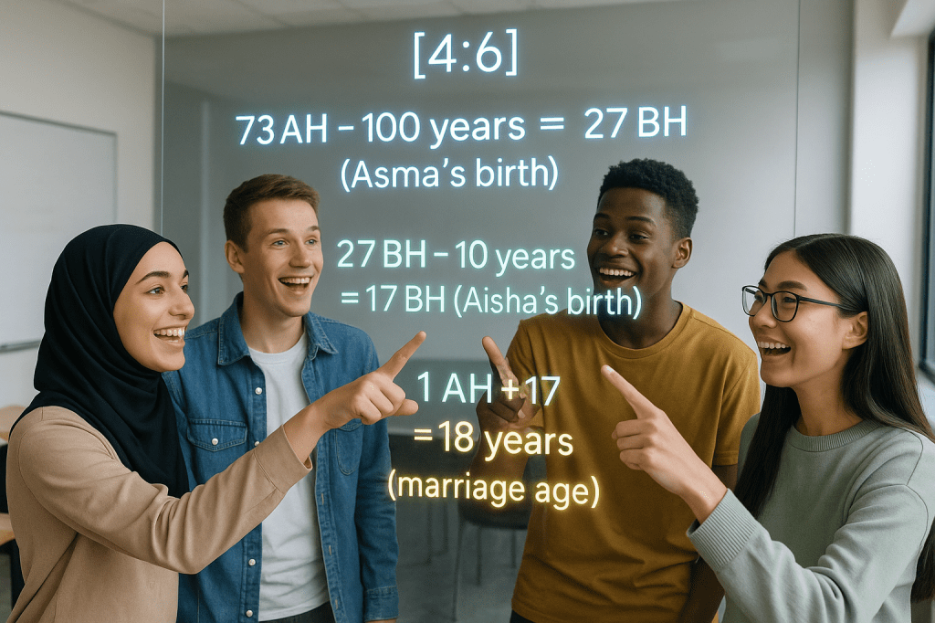 The most devastating evidence against the child marriage narrative comes from mathematical calculation using historically documented ages. Asma bint Abu Bakr, Aisha’s elder sister, provides our forensic timeline anchor. Historical sources unanimously agree that Asma was 10 years older than Aisha and died in 73 AH at age 100.