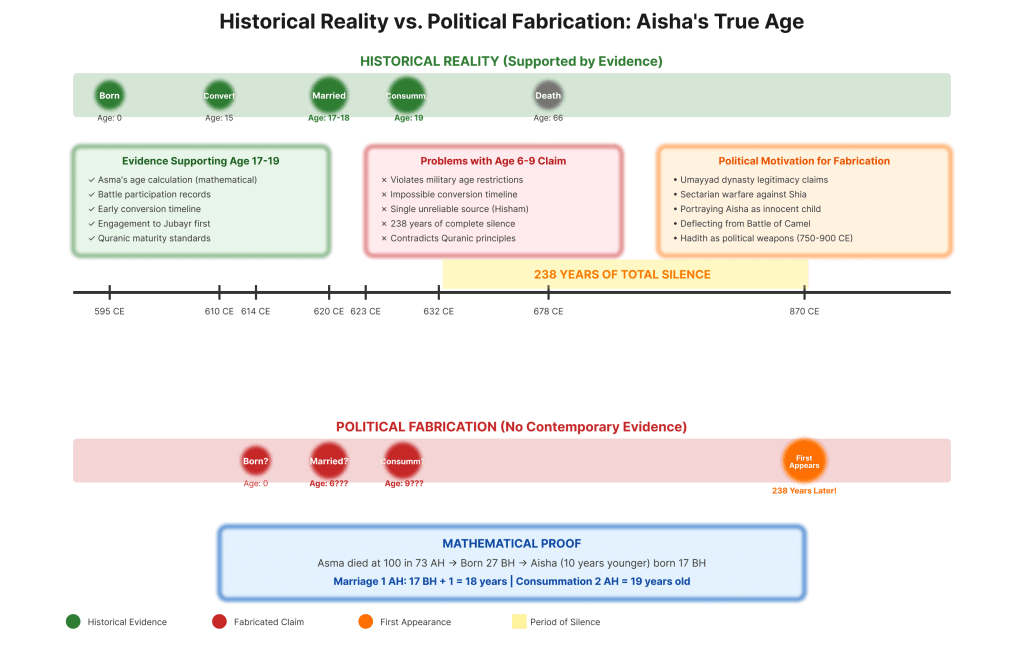 The evidence is overwhelming: Aisha was between 17-19 years old at marriage, making her an adult woman by all standards – historical, biological, and Quranic. The child marriage narrative was a political fabrication that emerged 238 years after the alleged events, created by a single unreliable narrator during documented mental decline, and strategically deployed by the Umayyad dynasty for sectarian warfare.