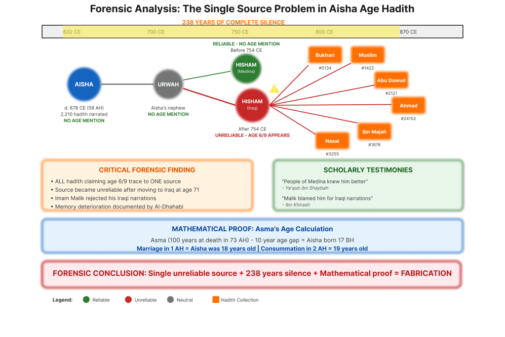 Every single hadith claiming Aisha was six or nine years old traces back to one man: Hisham ibn Urwah, specifically during his Iraq period after age 71. This creates what forensic analysts call a “single point of failure” – if this one source is unreliable, the entire narrative collapses.