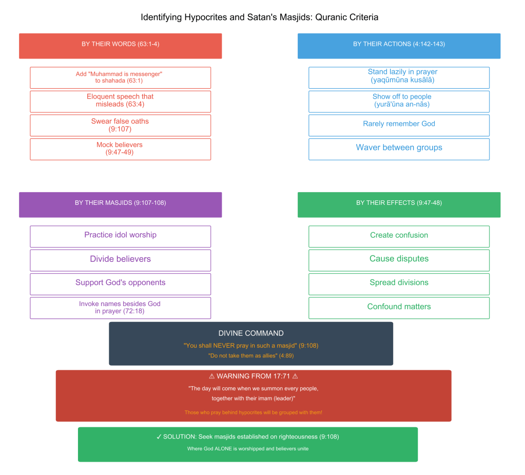 The evidence is overwhelming, the command is absolute, and the consequences are eternal. Verse 9:107 doesn’t suggest or recommend—it prohibits. God identifies Satan’s masjid by its hypocrite leadership and commands believers never to stand there.
