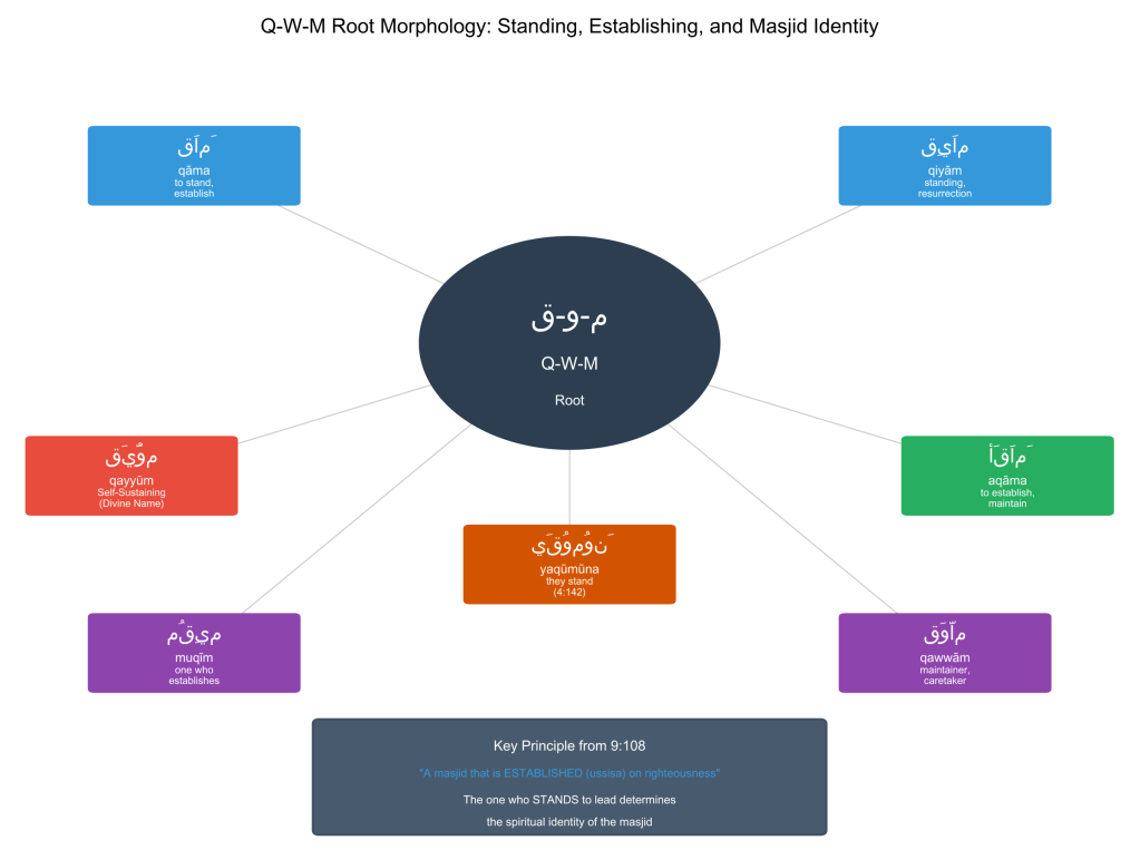 The mathematical proof alone devastates their position: the Q-W-M root appears 0 times in 9:107 describing Satan’s masjid, yet appears twice in 9:108 describing God’s masjid. This linguistic precision reveals that WHO stands to lead prayer literally establishes WHAT the masjid becomes. When hypocrites lead, their corrupted standing transforms any building into the very masjid God condemns.