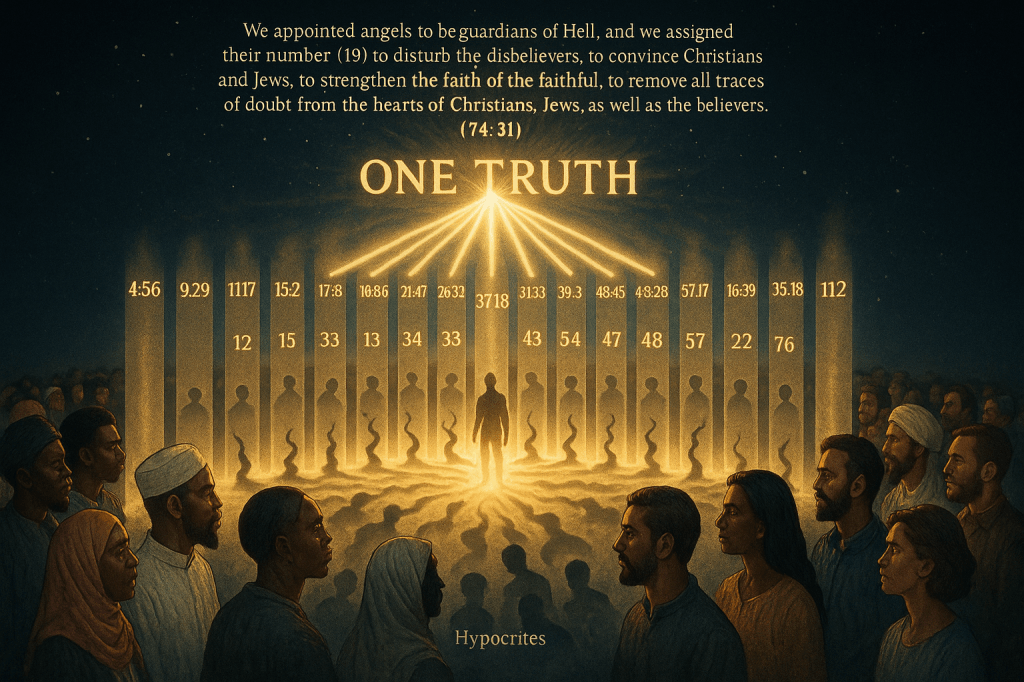 But mathematical signatures cannot be fabricated or debunked through human argumentation. The nineteen verses stand as divine testimony: multiple commands not to obey, requirements to be stern, descriptions of pollution and ego worship, warnings of Hell’s lowest pit, and clear statements that hypocrites’ prayers are worthless showing off. Each verse alone provides reason for caution; together, they create mathematical certainty.