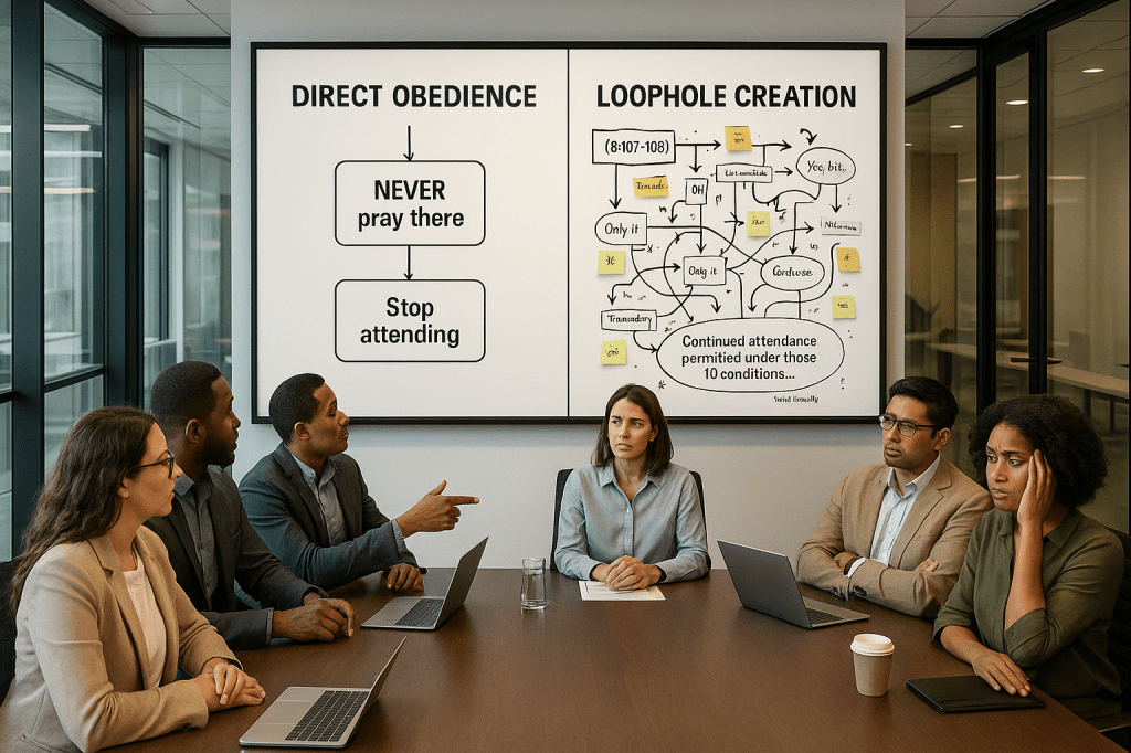 Quranic Response: [9:107-108] doesn’t say “don’t increase involvement” – it says “NEVER pray there.” This loophole creates a non-existent middle ground between full involvement and zero attendance, allowing continued violation at “current levels.”