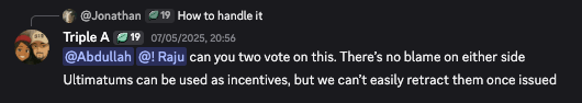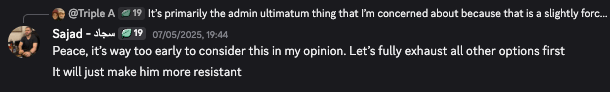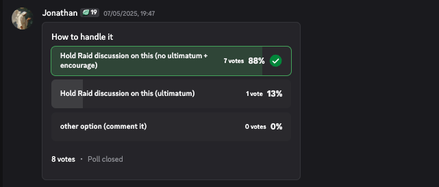 The May 7th debate included a poll where participants voted on the approach. The results: 7 out of 8 voted for “Hold Raid discussion on this (no ultimatum + encourage).” Only one vote (presumably Abdullah’s) supported the firm position with ultimatum. The compromise position won by overwhelming majority.