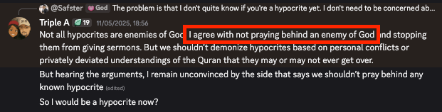 The evidence comes from a Discord theological debate on May 7, 2025, where participants discussed whether to give an admin named Peter an ultimatum regarding his continued attendance at a masjid whose leadership explicitly rejected Rashad Khalifa as God’s messenger. This debate reveals who truly advocates for Quranic principle versus who advocates for theological compromise.