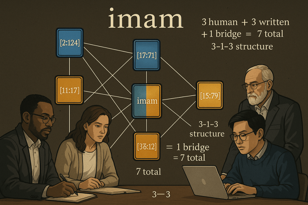 If we map the seven occurrences by primary meaning, we get: human (2:124), written (11:17), written (15:79), BOTH (17:71), human (25:74), written (36:12), written (46:12). This creates a pattern where the human and written meanings alternate and converge, with 17:71 as the pivotal verse where both meanings unite. This isn’t random distribution – it’s structured design showing that the two meanings aren’t competing interpretations but complementary aspects of the same concept.
