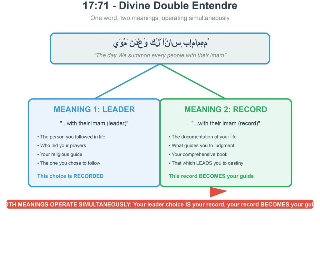 Now we arrive at the central insight: verse 17:71 is unique among all seven occurrences of “imam” because it’s the only verse where BOTH meanings operate simultaneously. This isn’t ambiguity requiring us to choose one meaning and reject the other. This is intentional dual meaning – a divine double entendre where both interpretations are correct and both are meant to be understood together.