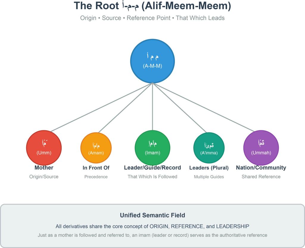 Before we can understand why “imam” carries dual meaning, we must understand the root from which it derives. The Arabic word “imam” (إِمَام) comes from the trilateral root أ-م-م (alif-meem-meem). This root carries a core semantic field centered around the concept of ORIGIN, SOURCE, REFERENCE POINT, and that which is FOLLOWED or LOOKED TO FOR GUIDANCE.