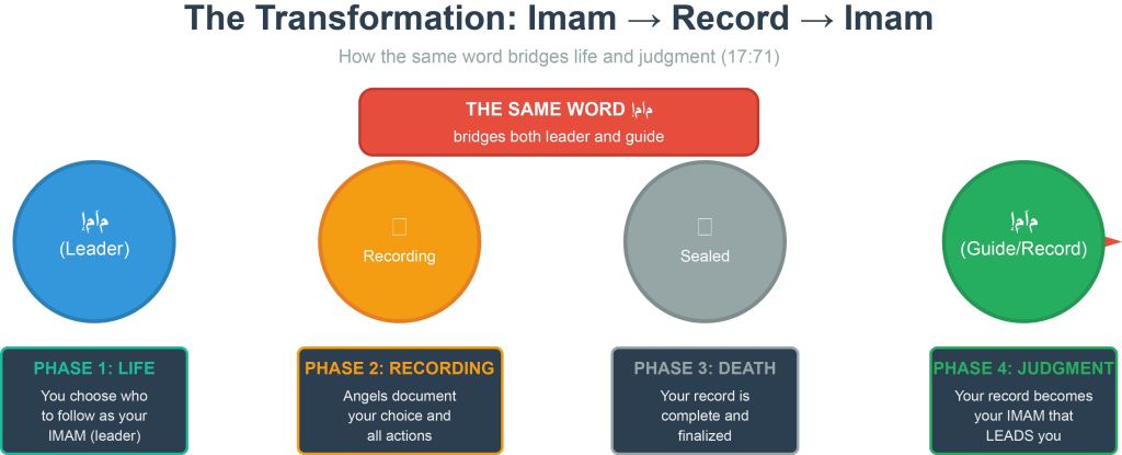 Your imam (the leader you follow) becomes your imam (the record that guides you) through the process of documentation and judgment. The SAME WORD bridges both realities because they ARE bridged in reality. Who you follow in life determines what guides you in death – not because the earthly leader accompanies you to judgment, but because your choice to follow that leader is the primary content of the record that does.