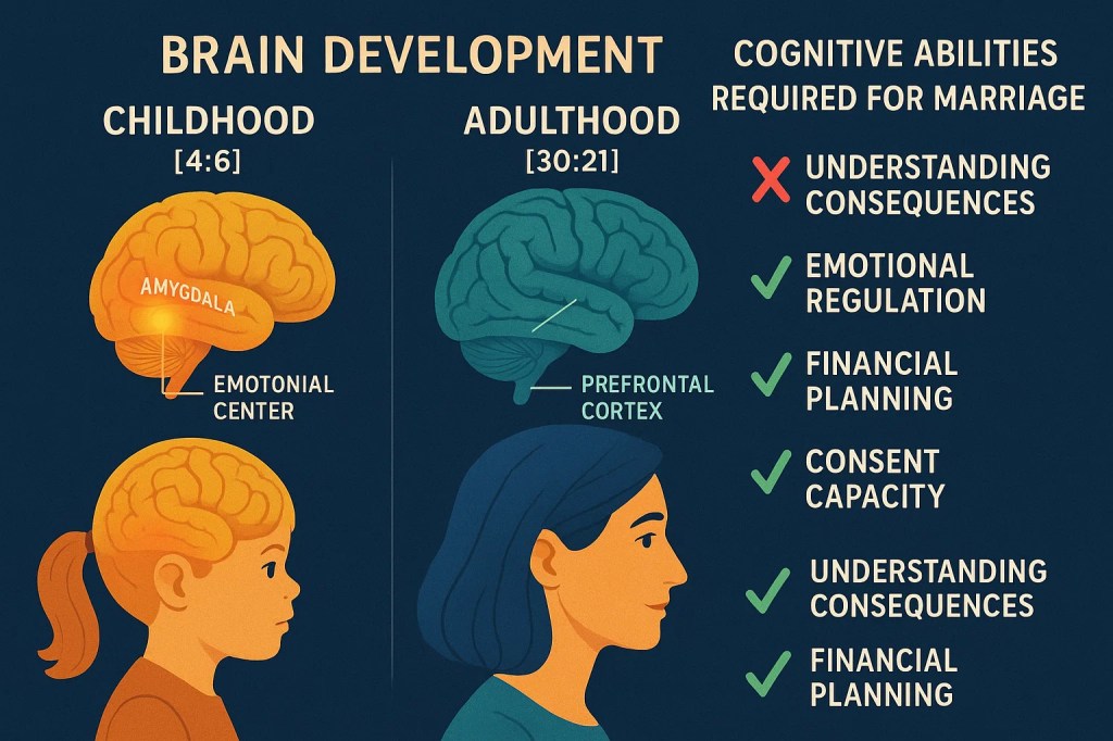 Modern neuroscience and developmental psychology confirm what the Quran established fourteen centuries ago: children lack the neurological development necessary for marriage decisions. The prefrontal cortex, responsible for complex decision-making, consequence evaluation, and emotional regulation, doesn’t fully develop until the mid-twenties. This scientific reality aligns perfectly with the Quran’s requirement for “رُشْدًا” (rushdan) – sound judgment that comes with maturity.