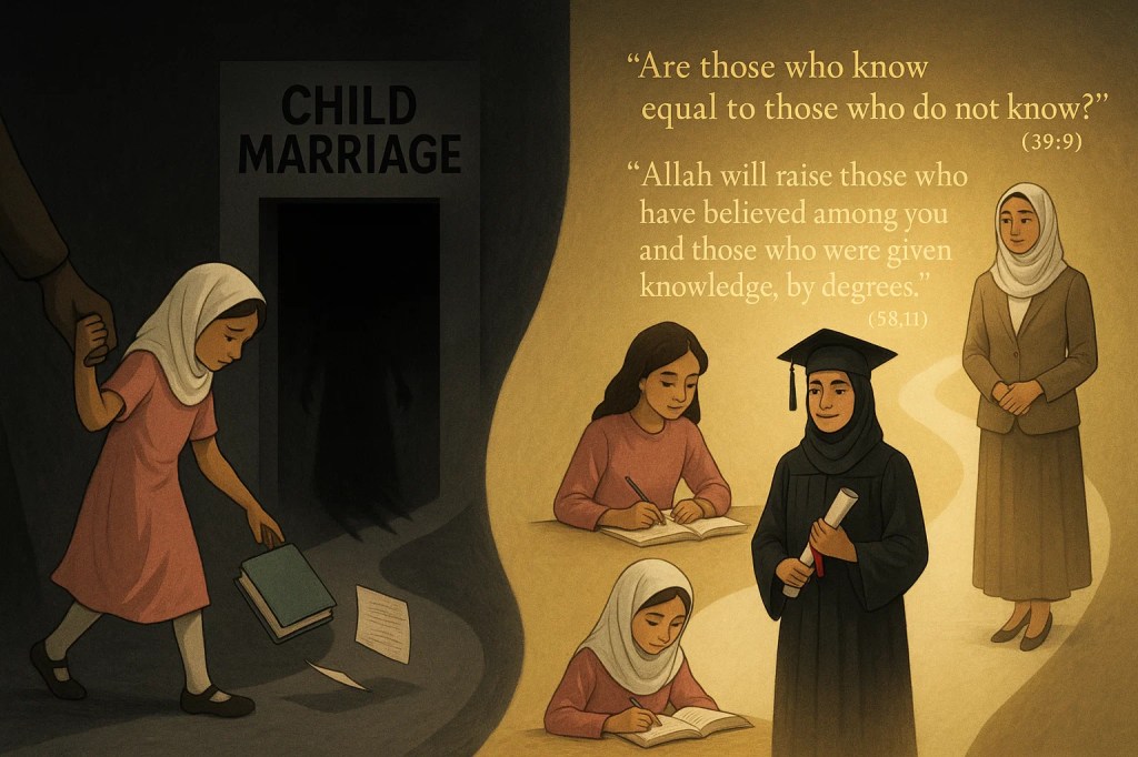 The Quran’s first revealed word was “Read!” (اقْرَأْ – iqra’), emphasizing the paramount importance of education. Child marriage typically ends a girl’s education, contradicting this fundamental Quranic value. Verse 58:11 promises elevated ranks for those who acquire knowledge: