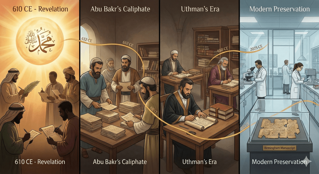 From this timeline, we can document the Quran’s journey from oral revelation to written compilation within 24 years of the Prophet’s death. And our physical manuscripts – particularly the Birmingham manuscript – date to this exact period or even earlier. The chain is unbroken, the evidence is tangible, and the consistency is undeniable.