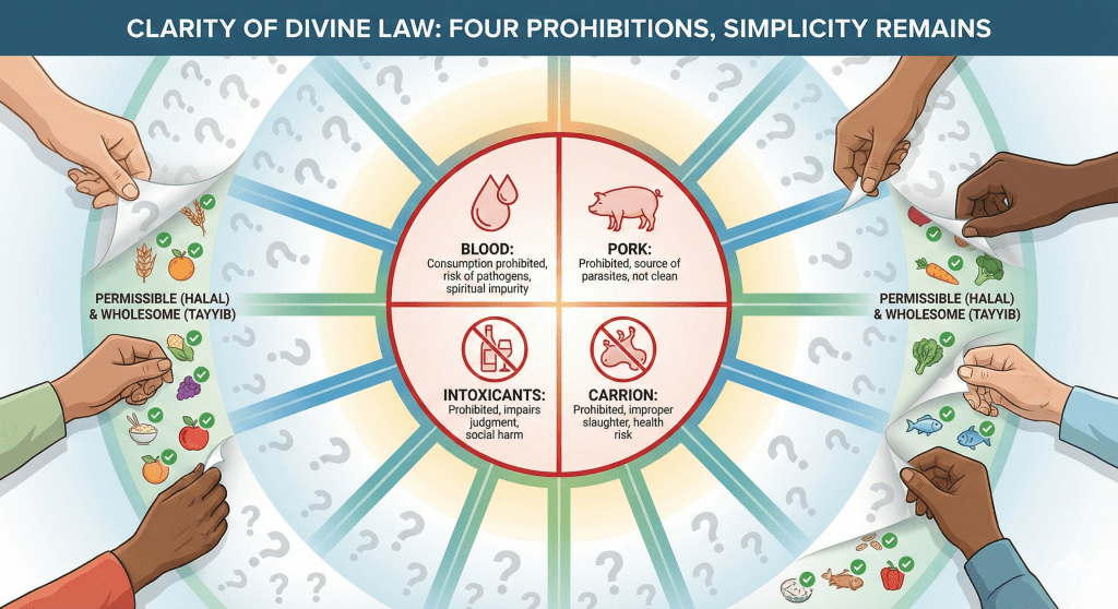 The word “only” (innama in Arabic) at the beginning of this verse is crucial. It is a restrictive particle that limits the prohibition to the items that follow. God is not saying “here are some examples” or “among the prohibited items are.” He is saying “He ONLY prohibits” – establishing a complete and exhaustive list.