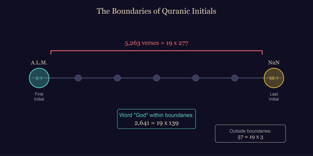This creates a complete mathematical framework: the total occurrences of “God” in the entire Quran divide into 19-based multiples both inside and outside the initialed sections. The boundaries marked by the initials – from A.L.M. to NuN – delineate a mathematically precise structure that encompasses the most important word in the entire scripture.