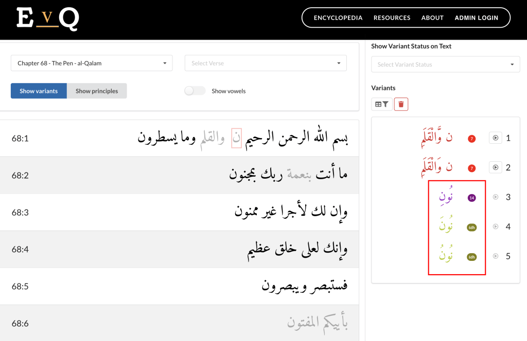 - Harvard University. “Encyclopedia of the (Variant) Readings of the Qur’an (EvQ/ErQ).” Alwaleed Islamic Studies Program. https://islamicstudies.harvard.edu/