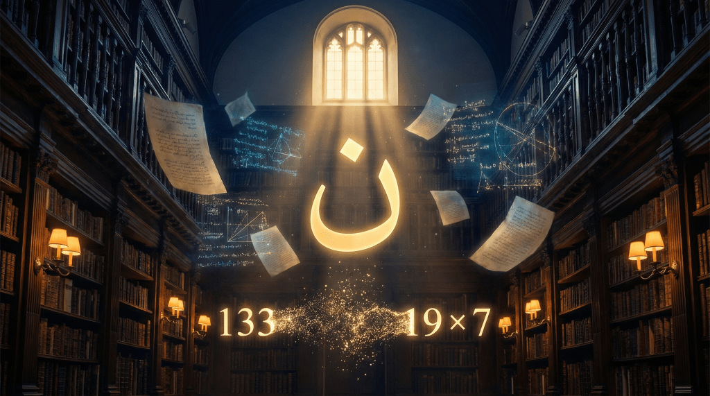 When we systematically count every occurrence of the letter N (ن) throughout Chapter 68, including the three N’s in the initial “NuN” (نون), we arrive at exactly 133 instances. This number is precisely divisible by 19, yielding the quotient 7. The equation 133 = 19 x 7 represents a mathematical signature that could not have been engineered by human design in the 7th century.