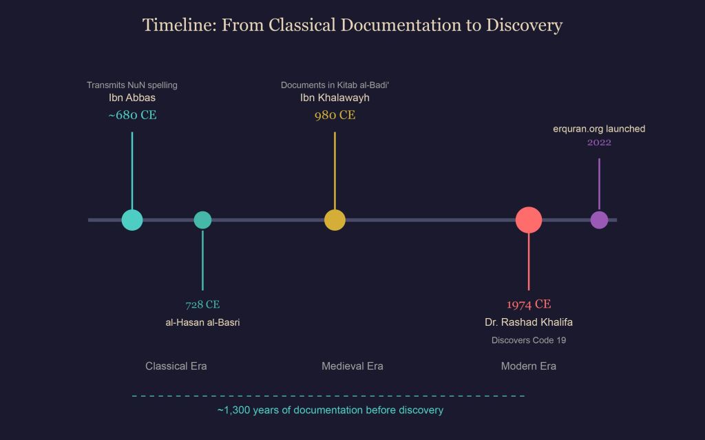 The scholarly chain stretching from Ibn Abbas through al-Hasan al-Basri to Ibn Khalawayh represents continuous, independent documentation of a reading that only acquired mathematical significance with the discovery of Code 19 in 1974. Modern digital scholarship through projects like erquran.org now makes this evidence accessible to anyone.