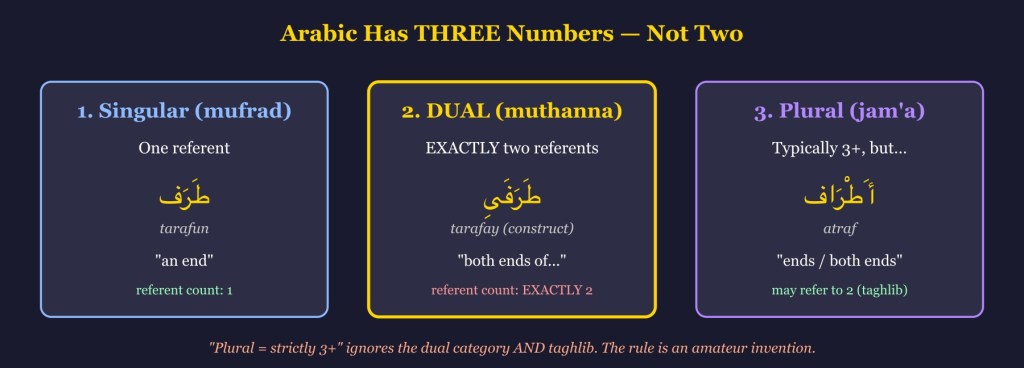 Put it this way: to say “the plural here is figurative, therefore plural-doesn’t-really-mean-plural” is to concede the thesis. You have just admitted that plural morphology does not mechanically encode “3+.” That concession is fatal to the zulafan and aṭrāf arguments, which depend entirely on the reverse assumption.