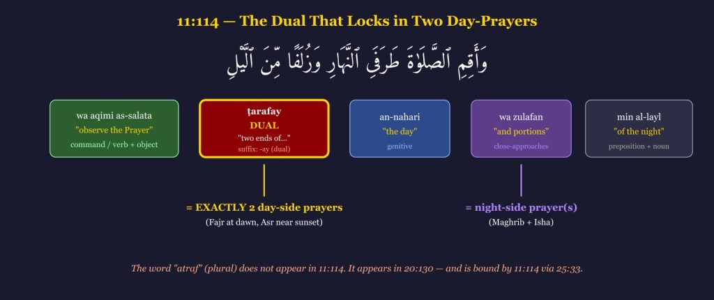 When Quranist-type debaters assert “plural means three or more, therefore zulafan and aṭrāf mean three or more of these things, therefore the five-prayer framework is false,” they have already lost the argument because they have misidentified the words. Ṭarafay in [11:114] is not plural. It is explicitly, unambiguously dual. Its very suffix says so. And the decisive verse in the prayer-timing cluster is [11:114]. Any interpretation of [20:130] must defer to it under the principle that the Quran explains itself ([25:33]).