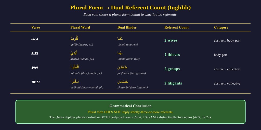 It is worth stating plainly at the outset: anyone who insists on “plural ⇒ strictly 3+” must either (a) deny that [66:4] refers to two specific women — contradicting the narrative in [66:3-5] — or (b) admit that plural-for-dual is a Quranic feature and abandon the argument. There is no third option.