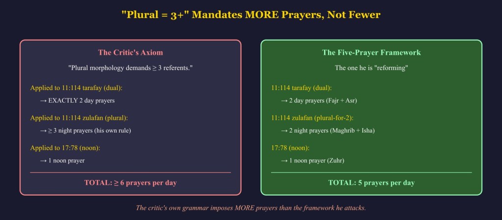 Day total: 2 (from ṭarafay) + 1 (noon from [17:78]) = 3. Night total (on his own reading): at least 3. Grand total: at least 6 prayers per day. His “plural = 3+” dogma does not reduce the five-prayer framework — it expands it. The framework he is attacking is less demanding than the framework his own grammar produces. His position is not a reform of the five-prayer practice; it is a strict additive on top of it. He is the innovator. He is the legalist imposing a heavier burden.