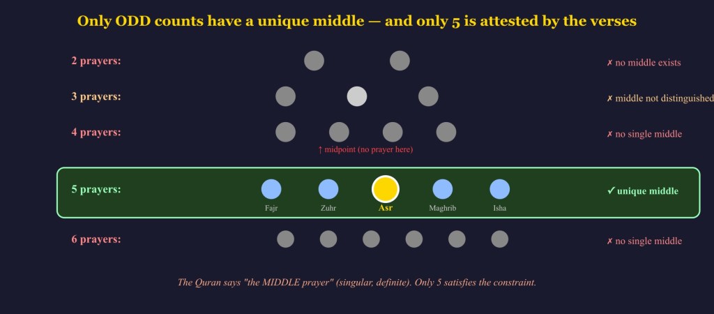 Only 5 (or a higher odd number unmotivated by the verses) satisfies [2:238]’s middle-prayer designation. Anti-prayer advocates who propose 3 or 2 cannot make the middle-prayer language function: 2 has no middle, and 3’s middle is not meaningfully distinguished — it is simply “the second of three,” requiring no superlative. Advocates of 4 or 6 have the same problem. The five-prayer count is the unique solution that honors aṣ-ṣalāti al-wusṭā.