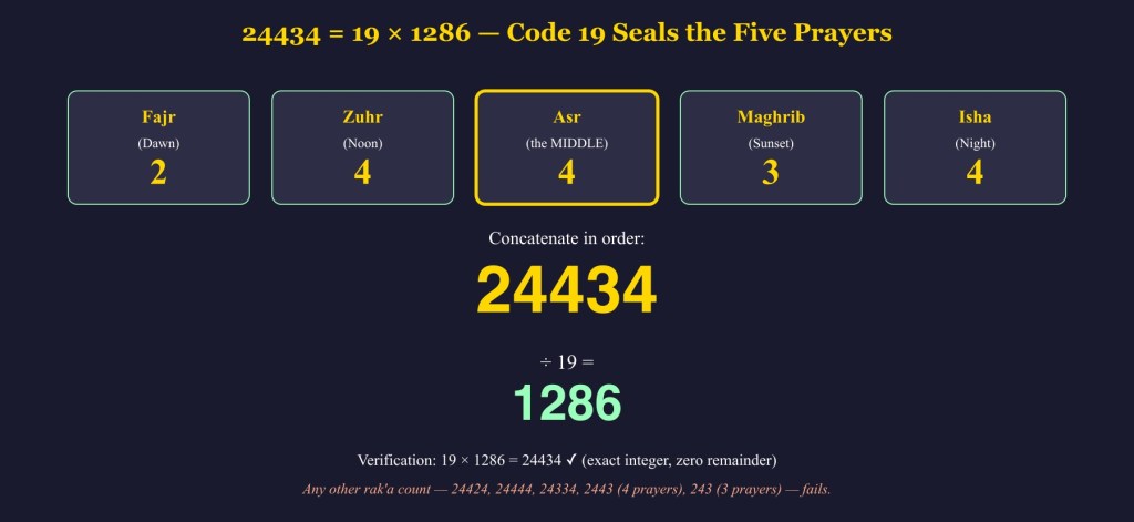 This sentence ends the debate. The five prayers have rak’a counts of 2, 4, 4, 3, 4 (Fajr, Zuhr, Asr, Maghrib, Isha respectively). Concatenated: 2-4-4-3-4 = 24434. Divide by 19: 24434 / 19 = 1286, an exact integer. Multiply back: 19 × 1286 = 24434. The fingerprint of the 19-based code — the same code that [74:30] declares “Over it is nineteen” — is on the rak’a structure of the five prayers.