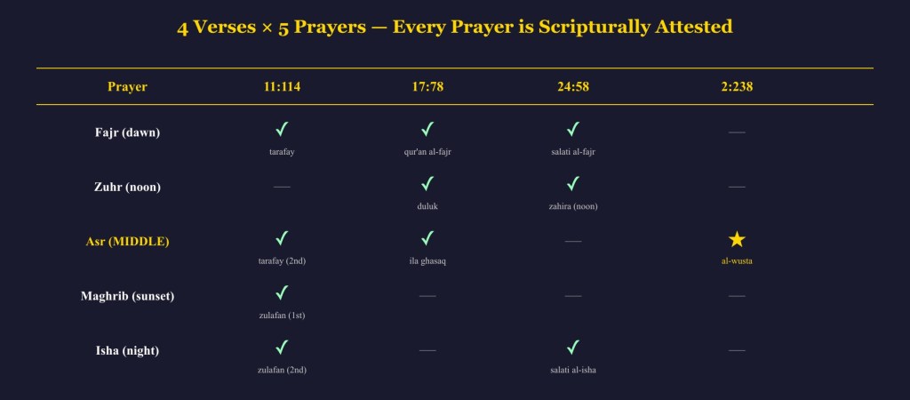 Now observe the logical bind for anti-prayer Quranists: if they claim “the Quran doesn’t specify prayer times,” they are directly contradicting [4:103], which asserts that the Prayers have specific, decreed times. Either the times are specified (in which case the cluster [11:114], [17:78], [24:58], [20:130], [2:238] must be the specification — the only plausible locus), or [4:103] is false. The second option is blasphemous; the first is the five-prayer framework. There is no middle ground.